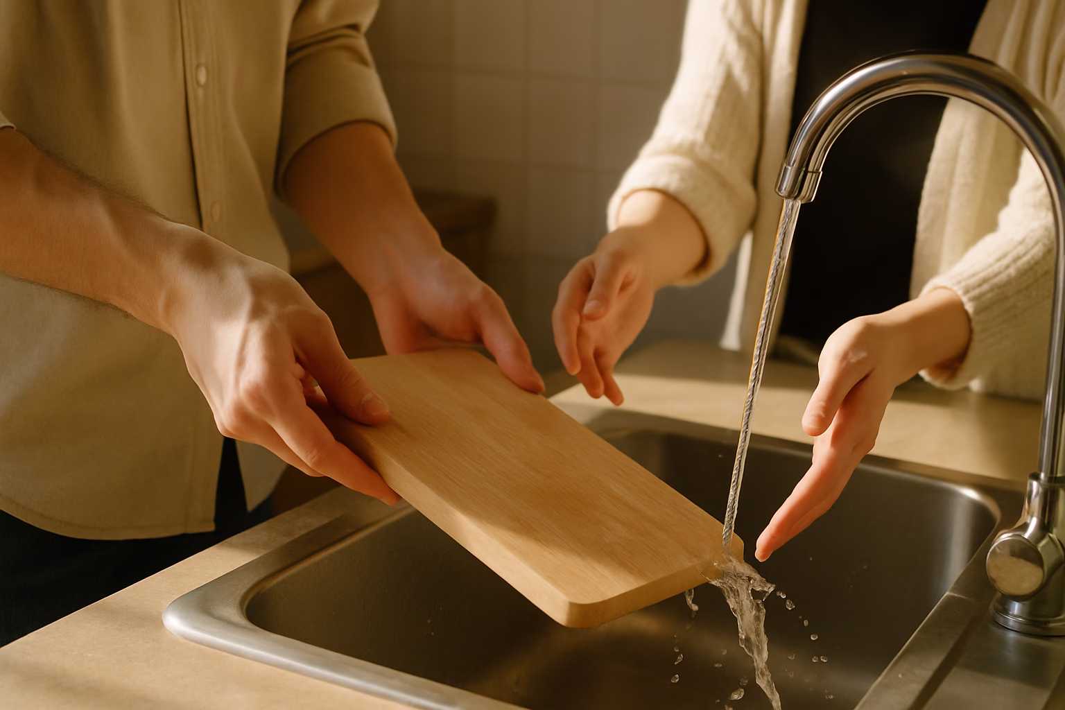 蛇口の水を流しながら、食材を切ったまな板を洗っていた。